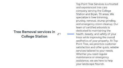 1. Top Point Tree Services is a trusted and experienced tree care company serving the College Station and Bryan, TX areas. We specialize in tree trimming, pruning, removal, stump grinding, and emergency storm cleanup. Our team of certified arborists is dedicated to maintaining the health, beauty, and safety of your trees while improving the overall aesthetics of your property. At Top Point Tree, we prioritize customer satisfaction and offer quick, reliable services tailored to your needs. Whether you need regular maintenance or emergency assistance, we are here to help your landscape flourish.