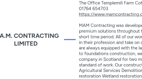 1. The Office Templemill Farm Cottage Crief Perthshire PH7 4HL Scotland 01764 654703 https://www.mamcontracting.co.uk/ MAM Contracting was developed in 2004 and gained a credibility for premium solutions throughout the construction sector in Scotland within a short time period. All of our workers are specialists in their field, fully trained in their profession and take on continuous in-house training to ensure they are always equipped with the latest best method. From bridge construction to foundations construction, we've become a prominent construction company in Scotland for two main reasons; our dedication and the highest standard of work. Our construction services consist of: Bridge Construction Agricultural Services Demolition and Recycling Forestry Work Peatland restoration Wetland restoration Groundworks construction.