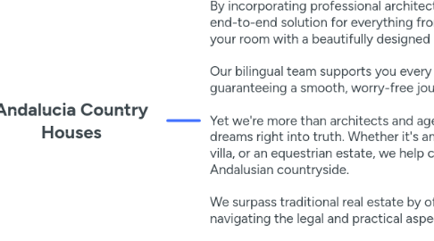 1. C. Lorenzo García, 26 29480 Gaucín Málaga Spain +34 689 99 21 63 https://www.andalucia-country-houses.com/ sales@andalucia-country-houses.com At Andalucia Country Houses & Architects, we provide greater than just properties-- we supply a full-spectrum, client-focused experience that brings your vision of life in southern Spain to fact. By incorporating professional architectural services with in-depth real estate expertise, we supply a seamless, end-to-end solution for everything from building a bespoke home to renovating a historic gem or enhancing your room with a beautifully designed kitchen or bathroom. Our bilingual team supports you every step of the way-- from the first principle to the final touches-- guaranteeing a smooth, worry-free journey that's guided by professionalism and trust, creativity, and accuracy. Yet we're more than architects and agents. At Andalucia Country Houses, we specialize in turning lifestyle dreams right into truth. Whether it's an enchanting bed and breakfast, a boutique rural hotel, a high-end country villa, or an equestrian estate, we help clients build not only homes, but businesses and lifestyles rooted in the Andalusian countryside. We surpass traditional real estate by offering extensive relocation support and professional advice for navigating the legal and practical aspects of living and operating in Spain. With a diverse portfolio of unique properties and a deep understanding of the region, we are proud to offer chances that align with your personal objectives and aspirations. What really distinguishes us is our dedication to tailored service-- before, throughout, and long after the sale. With intimate, first-hand knowledge of every property we represent, we ensure that each client gets the insight and assistance they need to make confident, informed decisions. At Andalucia Country Houses & Architects, we do not simply sell homes-- we help you create a life you love.