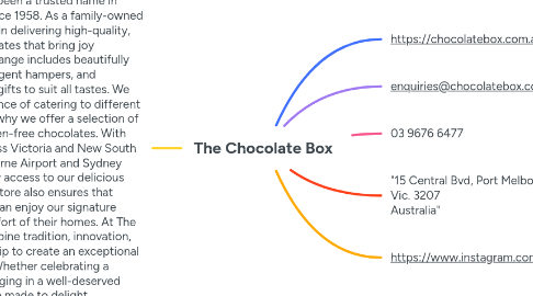 1. The Chocolate Box has been a trusted name in premium chocolates since 1958. As a family-owned business, we take pride in delivering high-quality, Australian-made chocolates that bring joy to every occasion. Our range includes beautifully crafted gift boxes, indulgent hampers, and personalised corporate gifts to suit all tastes. We understand the importance of catering to different dietary needs, which is why we offer a selection of vegan-friendly and gluten-free chocolates. With ten retail locations across Victoria and New South Wales, including Melbourne Airport and Sydney Airport, we provide easy access to our delicious chocolates. Our online store also ensures that customers nationwide can enjoy our signature creations from the comfort of their homes. At The Chocolate Box, we combine tradition, innovation, and quality craftsmanship to create an exceptional chocolate experience. Whether celebrating a special moment or indulging in a well-deserved treat, our chocolates are made to delight.