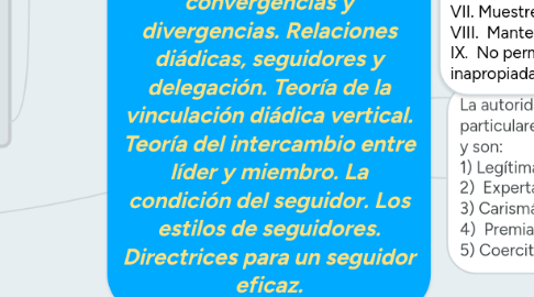 Poder y Autoridad, convergencias y divergencias. Relaciones diádicas, seguidores y delegación. Teoría de la vinculación diádica vertical. Teoría del intercambio entre líder y miembro. La condición del seguidor. Los estilos de seguidores. Directrices para un seguidor eficaz.