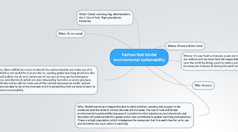 2. Why: Global warming is happening due to deforestation, causing less oxygen to be produced and the level of carbon dioxide will increase, The use of fuel will hinder environmental sustainability because it contains harmful substances and chemicals and factories will produce harmful gases which also contribute to global warming and pollution, There is a high population which inbalances the resources that this earth has for us to use and therefore we must ration it carefully