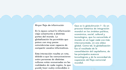 4. Mayor flujo de información En la época actual la información viaja velozmente a distintas partes del mundo. La globalización ha permitido que países con muy pocas coincidencias sean capaces de compartir canales informativos. Esta interacción resulta un reto, debido a que las comunicaciones entre personas de distintas culturas están enmarcadas en las realidades de cada región, lo que puede traer malos entendidos o poca fluidez en el intercambio. Sin embargo, y gracias a la globalización, se han desarrollado distintos canales y formas de efectuar el intercambio comunicativo que facilitan la interacción, y profesionales de diferentes sectores se enfocan en el desarrollo de estudios y estrategias que mejoren el flujo de información entre países.