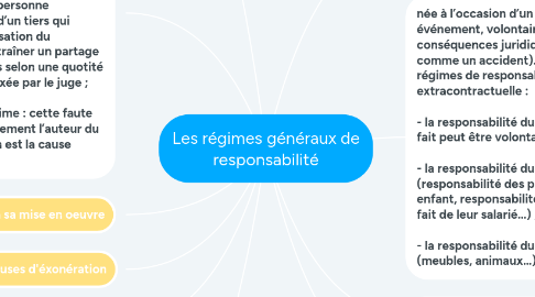 8. née à l’occasion d’un fait juridique (un événement, volontaire ou non, ayant des conséquences juridiques non voulues, comme un accident). Il existe plusieurs régimes de responsabilité extracontractuelle : - la responsabilité du fait personnel : le fait peut être volontaire ou non ; - la responsabilité du fait d’autrui (responsabilité des parents du fait de leur enfant, responsabilité des employeurs du fait de leur salarié…) ; - la responsabilité du fait des choses (meubles, animaux…).