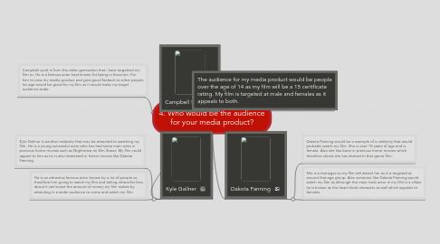 4.1. Dakota Fanning would be a example of a celebrity that would probably watch my film. She is over 15 years of age and is female. Also she has been in previous horror movies which therefore shows she has interest in that genre film.