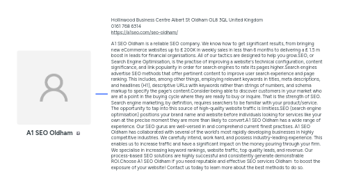 1. Hollinwood Business Centre Albert St Oldham OL8 3QL United Kingdom 0161 768 6314 https://a1seo.com/seo-oldham/ A1 SEO Oldham is a reliable SEO company. We know how to get significant results, from bringing new eCommerce websites up to ₤ 200K in weekly sales in less than 6 months to delivering a ₤ 1.5 m boost in leads for financial organisations. All of our tactics are designed to help you grow.SEO, or Search Engine Optimisation, is the practise of improving a website's technical configuration, content significance, and link popularity in order for search engines to rate its pages higher.Search engines advertise SEO methods that offer pertinent content to improve user search experience and page ranking. This includes, among other things, employing relevant keywords in titles, meta descriptions, and headlines (H1), descriptive URLs with keywords rather than strings of numbers, and schema markup to specify the page's content.Consider being able to discover customers in your market who are at a point in the buying cycle where they are ready to buy or inquire. That is the strength of SEO. Search engine marketing, by definition, requires searchers to be familiar with your product/service. The opportunity to tap into this source of high-quality website traffic is limitless.SEO (search engine optimisation) positions your brand name and website before individuals looking for services like your own at the precise moment they are more than likely to convert.A1 SEO Oldham has a wide range of experience. Our SEO gurus are well-versed in and comprehend current finest practises. A1 SEO Oldham has collaborated with several of the world's most rapidly developing businesses in highly competitive industries. We carefully intend, work hard, and possess industry-leading experience. This enables us to increase traffic and have a significant impact on the money pouring through your firm. We specialise in increasing keyword rankings, website traffic, top quality leads, and revenue. Our process-based SEO solutions are highly successful and consistently generate demonstrable ROI.Choose A1 SEO Oldham if you need reputable and effective SEO services Oldham to boost the exposure of your website! Contact us today to learn more about the best methods to do so.