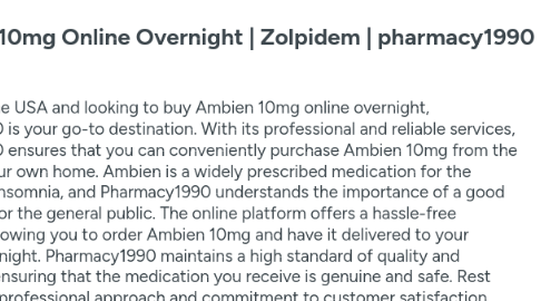 1. If you are in the USA and looking to buy Ambien 10mg online overnight, Pharmacy1990 is your go-to destination. With its professional and reliable services, Pharmacy1990 ensures that you can conveniently purchase Ambien 10mg from the comfort of your own home. Ambien is a widely prescribed medication for the treatment of insomnia, and Pharmacy1990 understands the importance of a good night's sleep for the general public. The online platform offers a hassle-free experience, allowing you to order Ambien 10mg and have it delivered to your doorstep overnight. Pharmacy1990 maintains a high standard of quality and authenticity, ensuring that the medication you receive is genuine and safe. Rest assured, their professional approach and commitment to customer satisfaction make Pharmacy1990 a trusted source for buying Ambien online in the USA. VISIT US: https://www.bark.com/en/us/company/buy-ambien-10mg-online-overnight--zolpidem--pharmacy1990/nobLl/