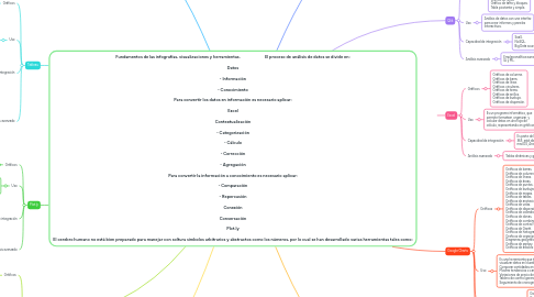 Fundamentos de las infografías, visualizaciones y herramientas. El proceso de análisis de datos se divide en: Datos - Información - Conocimiento Para convertir los datos en información es necesario aplicar: Excel Contextualización - Categorización - Cálculo - Corrección - Agregación Para convertir la información a conocimiento es necesario aplicar: - Comparación - Repercusión Conexión Conversación Plot.ly El cerebro humano no está bien preparado para manejar con soltura simbolos arbitrarios y abstractos como los números, por lo cual se han desarrollado varias herramientas tales como: par Mind Map: Fundamentos de las infografías, visualizaciones y herramientas.                        El proceso de análisis de datos se divide en:  Datos  - Información  - Conocimiento  Para convertir los datos en información es necesario aplicar:  Excel  Contextualización  - Categorización  - Cálculo  - Corrección  - Agregación  Para convertir la información a conocimiento es necesario aplicar:  - Comparación  - Repercusión  Conexión  Conversación  Plot.ly  El cerebro humano no está bien preparado para manejar con soltura simbolos arbitrarios y abstractos como los números, por lo cual se han desarrollado varias herramientas tales como: