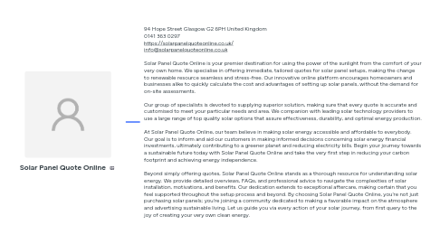1. 94 Hope Street Glasgow G2 6PH United Kingdom 0141 363 0297 https://solarpanelquoteonline.co.uk/ info@solarpanelquoteonline.co.uk Solar Panel Quote Online is your premier destination for using the power of the sunlight from the comfort of your very own home. We specialise in offering immediate, tailored quotes for solar panel setups, making the change to renewable resource seamless and stress-free. Our innovative online platform encourages homeowners and businesses alike to quickly calculate the cost and advantages of setting up solar panels, without the demand for on-site assessments. Our group of specialists is devoted to supplying superior solution, making sure that every quote is accurate and customised to meet your particular needs and area. We companion with leading solar technology providers to use a large range of top quality solar options that assure effectiveness, durability, and optimal energy production. At Solar Panel Quote Online, our team believe in making solar energy accessible and affordable to everybody. Our goal is to inform and aid our customers in making informed decisions concerning solar energy financial investments, ultimately contributing to a greener planet and reducing electricity bills. Begin your journey towards a sustainable future today with Solar Panel Quote Online and take the very first step in reducing your carbon footprint and achieving energy independence. Beyond simply offering quotes, Solar Panel Quote Online stands as a thorough resource for understanding solar energy. We provide detailed overviews, FAQs, and professional advice to navigate the complexities of solar installation, motivations, and benefits. Our dedication extends to exceptional aftercare, making certain that you feel supported throughout the setup process and beyond. By choosing Solar Panel Quote Online, you're not just purchasing solar panels; you're joining a community dedicated to making a favorable impact on the atmosphere and advertising sustainable living. Let us guide you via every action of your solar journey, from first query to the joy of creating your very own clean energy.