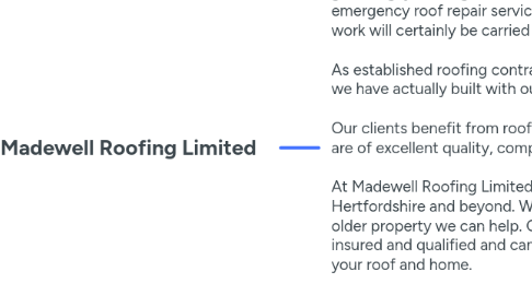 1. 362 Grace Way Stevenage Hertfordshire SG1 5AP UK 0345 835 8192 https://madewellroofingltd.co.uk/ info@madewellroofingltd.co.uk Madewell Roofing Limited is a local, knowledgeable roofing company that's dedicated to delivering first class roofing services across Hertfordshire and beyond. We are completely insured and certified in all aspects of domestic, commercial and industrial roofing. Our skilled roofers have many years of experience working with all types of roof. From a straightforward roof repair to a complete re-roof, a substitute flat roof or fascias, soffits and guttering, you will get a free no obligation survey and quote for the jobs you require. We also give an emergency roof repair service and will offer free professional advice to make sure that just the essential work will certainly be carried out. As established roofing contractors in Hertfordshire, we satisfaction ourselves on the solid partnerships we have actually built with our customers. Our clients benefit from roofers with a record of honesty and professionalism and our roofing services are of excellent quality, competitively priced and fully guaranteed. At Madewell Roofing Limited we carry out a wide range of roof repair services throughout Hertfordshire and beyond. Whether its emergency repair work or the restoration of a roof from an older property we can help. Our knowledgeable and well-informed roofers in Hertfordshire are fully insured and qualified and can swiftly repair any type of concern to restore the comfort and security of your roof and home. If you have a leak or notification something amiss with your roof, you require to have it inspected and repaired as soon as possible to avoid further expensive damages happening down the line. So, whether your roof was damaged by age, weather or general wear and tear, we provide free no obligation roof surveys and will advise you on the job to be carried out. Among the leading roof repair experts in Hertfordshire, we work with just the finest products to offer you with the finest quality roof repairs, suitable for any kind of domestic or commercial property. Our skilled roofers in Hertfordshire are readily available to carry out emergency roof repairs, excellent for storm damage or sudden leaks, we are happy to assist. With years in the roofing industry, there is very little that we have actually not come across, repaired, or replaced and we constantly obtain the task carried out to the greatest possible standards.