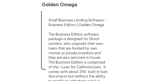 1. Small Business Lending Software - Business Edition | Golden Omega The Business Edition software package is designed for Direct Lenders, who originate their own loans that are funded by own monies or private investors and they are also serviced in-house. The Business Edition is comprised of the i-Loan for California loan; it comes with about 250 built-in loan documents but without the ability to modify or edit them and it is paired with the i-Servicing software module. The Business Edition package for small businesses is limited to 100 loans. Upgrades to other editions are available and Add-on Modules are optional. https://goldenomega.net/business-edition/