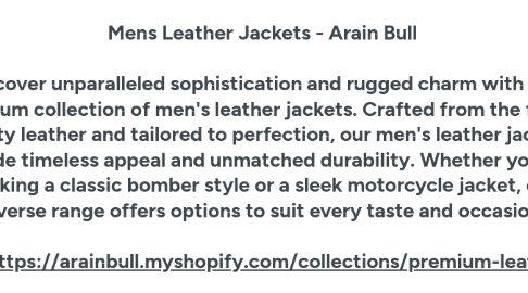 Mens Leather Jackets - Arain Bull Discover unparalleled sophistication and rugged charm with our premium collection of men's leather jackets. Crafted from the finest quality leather and tailored to perfection, our men's leather jackets exude timeless appeal and unmatched durability. Whether you're seeking a classic bomber style or a sleek motorcycle jacket, our diverse range offers options to suit every taste and occasion. Visit Now: https://arainbull.myshopify.com/collections/premium-leather-jackets