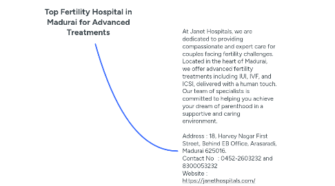 1. At Janet Hospitals, we are dedicated to providing compassionate and expert care for couples facing fertility challenges. Located in the heart of Madurai, we offer advanced fertility treatments including IUI, IVF, and ICSI, delivered with a human touch. Our team of specialists is committed to helping you achieve your dream of parenthood in a supportive and caring environment. Address : 18, Harvey Nagar First Street, Behind EB Office, Arasaradi, Madurai 625016. Contact No : 0452-2603232 and 8300053232 Website : https://janethospitals.com/ Facebook : https://www.facebook.com/people/Janet-Fertility-Center/100080779660585/ Instagram : https://www.instagram.com/janet_fertility_center/ YouTube : https://www.youtube.com/@janethospitals2085 Location : https://maps.app.goo.gl/mZaKXKmJ3tNW46m7A Services: Intrauterine Insemination (IUI), In Vitro Fertilization (IVF) and Intracytoplasmic Sperm Injection (ICSI)
