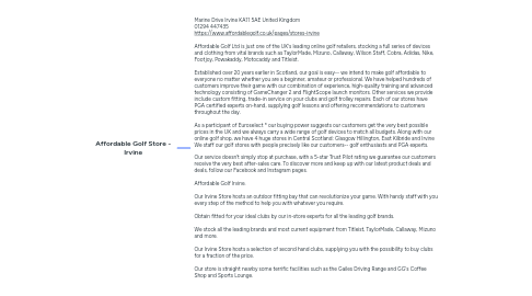 1. Marine Drive Irvine KA11 5AE United Kingdom 01294 447435 https://www.affordablegolf.co.uk/pages/stores-irvine Affordable Golf Ltd is just one of the UK's leading online golf retailers, stocking a full series of devices and clothing from vital brands such as TaylorMade, Mizuno, Callaway, Wilson Staff, Cobra, Adidas, Nike, Footjoy, Powakaddy, Motocaddy and Titleist. Established over 20 years earlier in Scotland, our goal is easy-- we intend to make golf affordable to everyone no matter whether you are a beginner, amateur or professional. We have helped hundreds of customers improve their game with our combination of experience, high-quality training and advanced technology consisting of GameChanger 2 and FlightScope launch monitors. Other services we provide include custom fitting, trade-in service on your clubs and golf trolley repairs. Each of our stores have PGA certified experts on-hand, supplying golf lessons and offering recommendations to customers throughout the day. As a participant of Euroselect * our buying power suggests our customers get the very best possible prices in the UK and we always carry a wide range of golf devices to match all budgets. Along with our online golf shop, we have 4 huge stores in Central Scotland: Glasgow Hillington, East Kilbride and Irvine We staff our golf stores with people precisely like our customers-- golf enthusiasts and PGA experts. Our service doesn't simply stop at purchase, with a 5-star Trust Pilot rating we guarantee our customers receive the very best after-sales care. To discover more and keep up with our latest product deals and deals, follow our Facebook and Instagram pages. Affordable Golf Irvine. Our Irvine Store hosts an outdoor fitting bay that can revolutionize your game. With handy staff with you every step of the method to help you with whatever you require. Obtain fitted for your ideal clubs by our in-store experts for all the leading golf brands. We stock all the leading brands and most current equipment from Titleist, TaylorMade, Callaway, Mizuno and more. Our Irvine Store hosts a selection of second hand clubs, supplying you with the possibility to buy clubs for a fraction of the price. Our store is straight nearby some terrific facilities such as the Gailes Driving Range and GG's Coffee Shop and Sports Lounge.