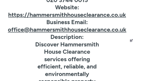 Business Name: Hammersmith House Clearance Business Address: 111 King St London, W6 9JG Business Phone: 020 3744 0015 Website: https://hammersmithhouseclearance.co.uk Business Email: office@hammersmithhouseclearance.co.uk Description: Discover Hammersmith House Clearance services offering efficient, reliable, and environmentally responsible property clearance tailored to your needs. Business Category: Crouch End house clearance, moving Opening Hours: 24/7