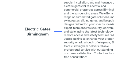 1. Address: 21 Oxford St, Birmingham, B5 5NR Phone: 01215170433 Website: https://electricgatesbirmingham.uk/ Electric Gates Birmingham specializes in the supply, installation, and maintenance of high-quality electric gates for residential and commercial properties across Birmingham and the surrounding areas. We offer a wide range of automated gate solutions, including swing gates, sliding gates, and bespoke designs tailored to your specific needs. Our expert team ensures security, convenience, and style, using the latest technology for remote access and safety features. Whether you’re looking to enhance your property’s security or add a touch of elegance, Electric Gates Birmingham delivers reliable, professional service with outstanding customer satisfaction. Contact us today for a free consultation! electric gates, automatic gates, automation, driveway gates, sliding gates, swing gates, commercial gates Hours: Monday - Friday 8AM - 5PM EMAIL: contact@electricgatesbirmingham.uk