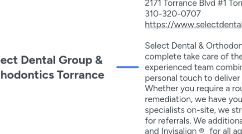 1. 2171 Torrance Blvd #1 Torrance CA 90501 USA 310-320-0707 https://www.selectdentaloffice.com/ Select Dental & Orthodontics is your trusted Torrance dentist, using complete take care of the entire family in one convenient place. Our experienced team combines sophisticated dental technology with a personal touch to deliver care that's both precise and compassionate. Whether you require a routine cleaning, dental implants, or full-mouth remediation, we have you covered. With an in-house laboratory and specialists on-site, we streamline your treatment without the requirement for referrals. We additionally supply orthodontic services including braces and Invisalign ® for all ages.