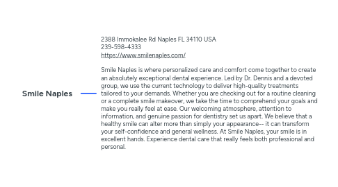 1. 2388 Immokalee Rd Naples FL 34110 USA 239-598-4333 https://www.smilenaples.com/ Smile Naples is where personalized care and comfort come together to create an absolutely exceptional dental experience. Led by Dr. Dennis and a devoted group, we use the current technology to deliver high-quality treatments tailored to your demands. Whether you are checking out for a routine cleaning or a complete smile makeover, we take the time to comprehend your goals and make you really feel at ease. Our welcoming atmosphere, attention to information, and genuine passion for dentistry set us apart. We believe that a healthy smile can alter more than simply your appearance-- it can transform your self-confidence and general wellness. At Smile Naples, your smile is in excellent hands. Experience dental care that really feels both professional and personal.