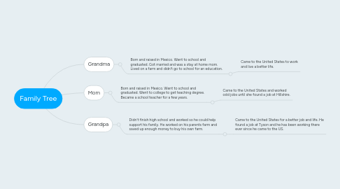 1.1. Born and raised in Mexico. Went to school and graduated. Got married and was a stay at home mom. Lived on a farm and didn't go to school for an education.
