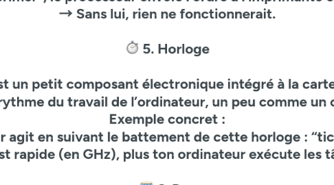 🖥️ 1. L’unité centrale (UC) 🔹 C’est la grande boîte de l’ordinateur (le boîtier) qu’on trouve souvent sous le bureau. À l’intérieur, il y a la carte mère, le processeur, la mémoire, le disque dur, etc. ➤ Elle contient tout ce qui fait “vivre” l’ordinateur. Exemple concret : quand tu appuies sur le bouton d’allumage, c’est l’unité centrale qui démarre et réveille tous les composants à l’intérieur. 💾 2. Mémoire interne 🔹 Elle est située à l’intérieur de l’unité centrale. Elle comprend : RAM (mémoire vive) : elle garde temporairement ce que tu fais. → Par exemple, quand tu écris un texte sur Word, il est d’abord dans la RAM. Si tu éteins l’ordinateur sans enregistrer, tout disparaît. ROM (mémoire morte) : elle contient les instructions de démarrage de l’ordinateur. → Quand tu allumes ton PC, c’est la ROM qui dit “réveille-toi et charge le système d’exploitation”. ⚡ 3. Mémoire cache 🔹 C’est une petite mémoire spéciale placée juste à côté du processeur. ➤ Elle garde les informations les plus souvent utilisées. Exemple concret : si tu ouvres souvent Google Chrome, la mémoire cache aide à le rouvrir plus vite la prochaine fois. Elle sert à gagner du temps. 🔢 4. Microprocesseur (CPU) 🔹 C’est une petite puce carrée, souvent sous un ventilateur à l’intérieur de l’unité centrale. ➤ Il exécute les calculs, les ordres et les instructions. Exemple concret : Quand tu cliques sur “Imprimer”, le processeur envoie l’ordre à l’imprimante en quelques millisecondes. → Sans lui, rien ne fonctionnerait. ⏱️ 5. Horloge 🔹 C’est un petit composant électronique intégré à la carte mère. ➤ Elle donne le rythme du travail de l’ordinateur, un peu comme un chef d’orchestre. Exemple concret : Le processeur agit en suivant le battement de cette horloge : “tic-tac-tic-tac”. Plus elle est rapide (en GHz), plus ton ordinateur exécute les tâches vite. 🚌 6. Bus 🔹 Imagine des autoroutes de données reliant les composants entre eux. ➤ Il existe trois types : Bus de données → transporte les informations (ex : les nombres à calculer). Bus d’adresse → indique où ces données doivent aller. Bus de contrôle → donne les ordres pour coordonner tout ça. Exemple concret : Quand tu ouvres une photo, les données passent du disque dur vers la RAM, puis vers l’écran via ces bus. 🔌 7. Interfaces 🔹 Ce sont les points de connexion entre l’unité centrale et les périphériques. ➤ Elles peuvent être physiques (ports USB, HDMI) ou logicielles (drivers). Exemple concret : Quand tu branches une clé USB, elle passe par une interface USB. L’ordinateur comprend grâce au driver comment communiquer avec elle. ⌨️ 8. Périphériques 🔹 Ce sont tous les appareils externes que tu connectes à l’unité centrale. Périphériques d’entrée : clavier (tu écris), souris (tu commandes), micro (tu parles). Périphériques de sortie : écran (il montre), imprimante (elle imprime), haut-parleur (il émet le son). Périphériques d’entrée/sortie : clé USB, disque dur externe (ils lisent et écrivent). Exemple concret : Quand tu tapes sur ton clavier, c’est un périphérique d’entrée qui envoie les lettres vers le processeur. (1)