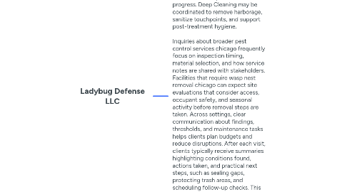 1. Ladybug Defense LLC offers integrated approaches for managing pests and maintaining cleaner, safer environments in residential and commercial settings. Teams coordinate assessments, tailored plans, and scheduled follow-ups to align with building policies and occupant needs. When property managers compare pest control companies chicago, they often weigh response planning, inspection depth, and prevention steps that fit their facilities. Typical programs combine Emergency Response Services with routine monitoring, using Baiting and Trapping where appropriate and noting Environmental considerations. Homeowners and facility leads researching pest control chicago may need rapid triage for sudden activity, followed by documentation and recommendations. Service plans often address Mosquitos, Wasps, Rodents, Roaches, and Ants, with Pest Exclusion to help reduce entry points and moisture conditions. For multi-unit buildings dealing with bed bugs chicago, technicians usually outline preparation guidance, furniture checks, targeted applications, and scheduled re-inspections to track progress. Deep Cleaning may be coordinated to remove harborage, sanitize touchpoints, and support post-treatment hygiene. Inquiries about broader pest control services chicago frequently focus on inspection timing, material selection, and how service notes are shared with stakeholders. Facilities that require wasp nest removal chicago can expect site evaluations that consider access, occupant safety, and seasonal activity before removal steps are taken. Across settings, clear communication about findings, thresholds, and maintenance tasks helps clients plan budgets and reduce disruptions. After each visit, clients typically receive summaries highlighting conditions found, actions taken, and practical next steps, such as sealing gaps, protecting trash areas, and scheduling follow-up checks. This structured process supports continuity between visits, clarifies expectations for occupants and managers, and helps align service frequency with changing site conditions over time. Contact Us: Phone: 312-248-8959 Address: 1100 W Cermak Rd, Chicago, IL, 60608 Website Url: https://www.ladybugdefensellc.com/ External Links: blogfreely.net: https://blogfreely.net/ladybugdefensellc/ladybug-defense-llc-provides-practical-support-for-homes-and-businesses-that able2know.org: https://able2know.org/user/ladybugdefensellc/ codeberg.org: https://codeberg.org/ladybugdefensellc instaconnect.co: https://instaconnect.co//ladybugdefensellc pexels.com: https://www.pexels.com/@ladybug-defense-llc-2159984762/