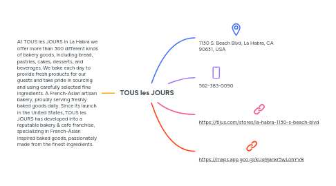 1. At TOUS les JOURS in La Habra we offer more than 300 different kinds of bakery goods, including bread, pastries, cakes, desserts, and beverages. We bake each day to provide fresh products for our guests and take pride in sourcing and using carefully selected fine ingredients. A French-Asian artisan bakery, proudly serving freshly baked goods daily. Since its launch in the United States, TOUS les JOURS has developed into a reputable bakery & cafe franchise, specializing in French-Asian inspired baked goods, passionately made from the finest ingredients.