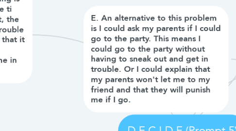 2. E. An alternative to this problem is I could ask my parents if I could go to the party. This means I could go to the party without having to sneak out and get in trouble. Or I could explain that my parents won't let me to my friend and that they will punish me if I go.