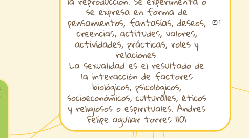 sexualidad se refiere a una dimensión fundamental del hecho de ser un ser humano: Basada en el sexo, incluye al género, las identidades de sexo y género, la orientación sexual, el erotismo, la vinculación afectiva y el amor, y la reproducción. Se experimenta o se expresa en forma de pensamientos, fantasías, deseos, creencias, actitudes, valores, actividades, prácticas, roles y relaciones. La sexualidad es el resultado de la interacción de factores biológicos, psicológicos, socioeconómicos, culturales, éticos y religiosos o espirituales. Andres Felipe aguilar torres 1101
