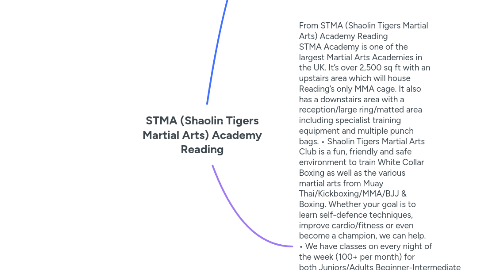 2. From STMA (Shaolin Tigers Martial Arts) Academy Reading STMA Academy is one of the largest Martial Arts Academies in the UK. It’s over 2,500 sq ft with an upstairs area which will house Reading’s only MMA cage. It also has a downstairs area with a reception/large ring/matted area including specialist training equipment and multiple punch bags. • Shaolin Tigers Martial Arts Club is a fun, friendly and safe environment to train White Collar Boxing as well as the various martial arts from Muay Thai/Kickboxing/MMA/BJJ & Boxing. Whether your goal is to learn self-defence techniques, improve cardio/fitness or even become a champion, we can help. • We have classes on every night of the week (100+ per month) for both Juniors/Adults Beginner-Intermediate to Advanced levels.has a downstairs area with a reception/large ring/matted area including specialist training equipment and multiple punch bags. • Shaolin Tigers Martial Arts Club is a fun, friendly and safe environment to train White Collar Boxing as well as the various martial arts from Muay Thai/Kickboxing/MMA/BJJ & Boxing. Whether your goal is to learn self-defense techniques, improve cardio/fitness or even become a champion, we can help. • We have classes on every night of the week (100+ per month) for both Juniors/Adults Beginner-Intermediate to Advanced levels."