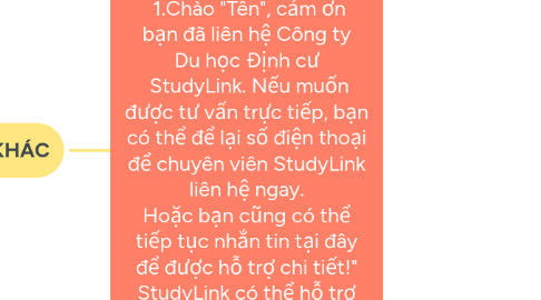 KỊCH BẢN BIZCHAT 1.Chào "Tên", cảm ơn bạn đã liên hệ Công ty Du học Định cư StudyLink. Nếu muốn được tư vấn trực tiếp, bạn có thể để lại số điện thoại để chuyên viên StudyLink liên hệ ngay. Hoặc bạn cũng có thể tiếp tục nhắn tin tại đây để được hỗ trợ chi tiết!" StudyLink có thể hỗ trợ bạn dịch vụ gì ạ?