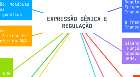 2. Conexões e Fluxo: DNA → Transcrição → mRNA → Tradução → Proteína Regulação Transcricional e Epigenética atuam antes da Tradução. Silenciamento Gênico afeta a Tradução após a Transcrição.