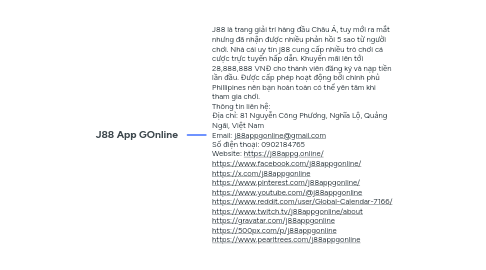 1. J88 là trang giải trí hàng đầu Châu Á, tuy mới ra mắt nhưng đã nhận được nhiều phản hồi 5 sao từ người chơi. Nhà cái uy tín j88 cung cấp nhiều trò chơi cá cược trực tuyến hấp dẫn. Khuyến mãi lên tới 28,888,888 VNĐ cho thành viên đăng ký và nạp tiền lần đầu. Được cấp phép hoạt động bởi chính phủ Phillipines nên bạn hoàn toàn có thể yên tâm khi tham gia chơi. Thông tin liên hệ: Địa chỉ: 81 Nguyễn Công Phương, Nghĩa Lộ, Quảng Ngãi, Việt Nam Email: j88appgonline@gmail.com Số điện thoại: 0902184765 Website: https://j88appg.online/ https://www.facebook.com/j88appgonline/ https://x.com/j88appgonline https://www.pinterest.com/j88appgonline/ https://www.youtube.com/@j88appgonline https://www.reddit.com/user/Global-Calendar-7166/ https://www.twitch.tv/j88appgonline/about https://gravatar.com/j88appgonline https://500px.com/p/j88appgonline https://www.pearltrees.com/j88appgonline