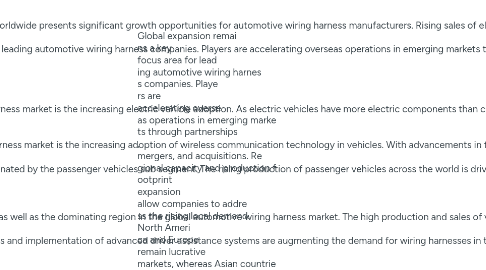 2. The automotive wiring harness market has witnessed significant growth in recent years owing to the rising adoption of electric vehicles across the globe. An automotive wiring harness refers to an assembly of wires or cables that transmits electric power or data signals within a vehicle. It is considered as an important component in vehicles used to transmit information and power to various electronic components and systems. The growing integration of advanced electric and electronic components in automobiles has fueled the demand for wiring harnesses. Increasing connectivity and autonomous driving features have also augmented market growth. The Global automotive wiring harness market is estimated to be valued at US$ 66.24 Mn in 2024 and is expected to exhibit a CAGR of 7.7% over the forecast period 2024 To 2031. Key Takeaways Key players operating in the automotive wiring harness market are Sumitomo Electric Industries, Ltd, Lear Corporation, Leoni AG, Motherson Group, Yazaki Corporation, Aptiv PLC, Furukawa Electric Co, Delphi Automotive LLP, Furukawa Electric Co. Ltd, Nexans Autoelectric, Yura Corporation, THB Group, BorgWarner, Inc, Nexans Autoelectric GmbH, and AmWINS Group Inc. These players are focusing on new product development, partnerships, and geographical expansion to gain a competitive edge in the market. The increasing adoption of electric vehicles worldwide presents significant growth opportunities for automotive wiring harness manufacturers. Rising sales of electric vehicles will boost demand for sophisticated wiring systems. OEMs and wiring harness suppliers are investing heavily in developing intelligent and lightweight wiring harnesses suitable for electric mobility applications. Global expansion remains a key focus area for leading automotive wiring harness companies. Players are accelerating overseas operations in emerging markets through partnerships, mergers, and acquisitions. Regional capacity and production footprint expansion allow companies to address the rising local demand. North America and Europe remain lucrative markets, whereas Asian countries, particularly China, offer high growth potential. Market Drivers and Restrain The major driver for the automotive wiring harness market is the increasing electric vehicle adoption. As electric vehicles have more electric components than conventional vehicles, they require a more complex wiring system. The rising sales of electric vehicles therefore boost the demand for advanced wiring harnesses. Another key driver is the increasing automation and connectivity in modern vehicles. Features like advanced driver assistance systems, infotainment systems require robust wiring system for seamless transmission of power and data between various electronic control units. The key restraint for the automotive wiring harness market is the increasing adoption of wireless communication technology in vehicles. With advancements in technologies like Bluetooth, WiFi, and 5G networks, automakers are increasing the use of wireless transmission of data between components in place of wiring harnesses. Wireless technology offers benefits like reduced weight, simpler assembly and installation. This could negatively impact the demand growth for traditional wiring systems over the long term. However, complete elimination of wired systems is not feasible in the foreseeable future considering reliability and security concerns. Segment Analysis The automotive wiring harness market is dominated by the passenger vehicles sub segment. The rising production of passenger vehicles across the world is driving the growth of this sub segment. Passenger vehicles require complex wiring harnesses compared to commercial vehicles owing to the presence of more advanced features and growing electrification. Developing economies are witnessing higher sales of passenger vehicles, boosting the demand for wiring harnesses in these regions. Global Analysis The Asia Pacific region is the fastest growing as well as the dominating region in the global automotive wiring harness market. The high production and sales of vehicles, especially passenger cars, in China, India, Japan, and South Korea are fueling the growth of the automotive wiring harness market in Asia Pacific. Additionally, growing electrification of vehicles and implementation of advanced driver assistance systems are augmenting the demand for wiring harnesses in this region. Increasing investments by OEMs and harness manufacturers in developing nations to leverage lower labor and raw material costs are strengthening the position of Asia Pacific in the global market.