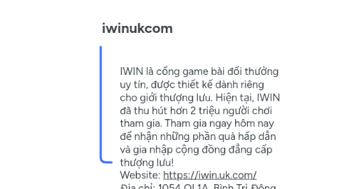 1. IWIN là cổng game bài đổi thưởng uy tín, được thiết kế dành riêng cho giới thượng lưu. Hiện tại, IWIN đã thu hút hơn 2 triệu người chơi tham gia. Tham gia ngay hôm nay để nhận những phần quà hấp dẫn và gia nhập cộng đồng đẳng cấp thượng lưu! Website: https://iwin.uk.com/ Địa chỉ: 1054 QL1A, Bình Trị Đông B, Bình Tân, Hồ Chí Minh, Việt Nam. Zipcode: 700000 Phone: 0322287998 Email: info@iwin.uk.com