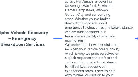 1. At Alpha Recovery Services Ltd, we provide fast and reliable vehicle recovery and breakdown assistance across Hertfordshire, covering Stevenage, Watford, St Albans, Hemel Hempstead, Welwyn Garden City, and surrounding areas. Whether you've broken down at the roadside, need emergency towing, or require long-distance vehicle transportation, our team is available 24/7 to get you moving again. We understand how stressful it can be when your vehicle breaks down, which is why we pride ourselves on a quick response and professional service. From roadside assistance to full vehicle recovery, our experienced team is here to help with minimal disruption to your day. Wherever you are in Hertfordshire, we’re just a phone call away. Contact us anytime