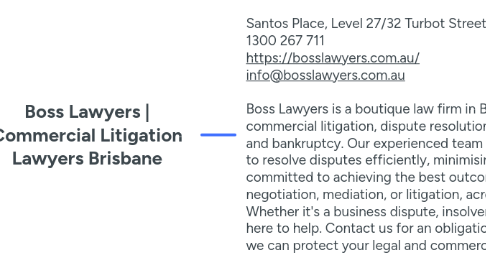 1. Santos Place, Level 27/32 Turbot Street Brisbane City QLD 4000 Australia 1300 267 711 https://bosslawyers.com.au/ info@bosslawyers.com.au Boss Lawyers is a boutique law firm in Brisbane specialising in commercial litigation, dispute resolution, construction law, insolvency, and bankruptcy. Our experienced team provides proactive legal advice to resolve disputes efficiently, minimising costs and disruptions. We are committed to achieving the best outcomes for clients through negotiation, mediation, or litigation, across all courts in Australia. Whether it's a business dispute, insolvency, or construction issue, we are here to help. Contact us for an obligation-free consultation and see how we can protect your legal and commercial interests.