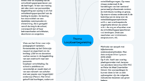 22. Context: Ik ben een derdejaars stagiaire (leraar geschiedenis) en ik ga in periode 2 een mini-onderzoek uitvoeren naar de aanpak van de school (het Orion lyceum) m.b.t. het bepalen van de ontwikkelingsperspectieven v.d. leerling. Hiervoor kijk ik naar de eerste jaars leerlingen (klas 1 a en 1 b), dit is een groep van circa 40 leerlingen. Op micro-niveau onderzoek ik de individuele leerling en zijn of haar ontwikkelingsvragen. Op meso niveau onderzoek ik de handelingen van het werkend personeel/professionals rondom de individuele leerling en groep. Op macro-niveau onderzoek ik de beleving van de zorg voor de ontwikkelingsperspectieven a.d.h.v. een overkoepelende organisatie binnen de school m.b.t. de zorg en afspraken over de ontwikkelingsperspectieven v.d. leerlingen. Denk aan resultaten van in/uitstroom, zorgcasussen, etc.