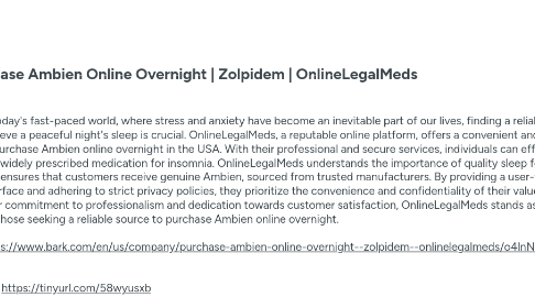 1. In today's fast-paced world, where stress and anxiety have become an inevitable part of our lives, finding a reliable solution to achieve a peaceful night's sleep is crucial. OnlineLegalMeds, a reputable online platform, offers a convenient and efficient way to purchase Ambien online overnight in the USA. With their professional and secure services, individuals can effortlessly access this widely prescribed medication for insomnia. OnlineLegalMeds understands the importance of quality sleep for overall well-being and ensures that customers receive genuine Ambien, sourced from trusted manufacturers. By providing a user-friendly interface and adhering to strict privacy policies, they prioritize the convenience and confidentiality of their valued clients. With their commitment to professionalism and dedication towards customer satisfaction, OnlineLegalMeds stands as a trusted option for those seeking a reliable source to purchase Ambien online overnight. https://www.bark.com/en/us/company/purchase-ambien-online-overnight--zolpidem--onlinelegalmeds/o4lnN/