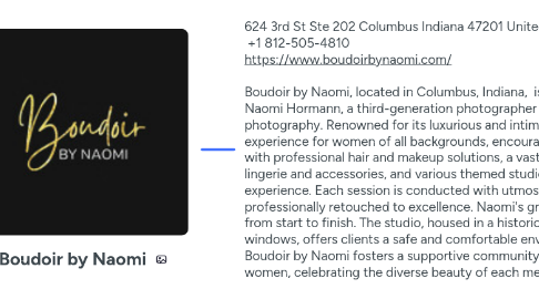1. 624 3rd St Ste 202 Columbus Indiana 47201 United States +1 812-505-4810 https://www.boudoirbynaomi.com/ Boudoir by Naomi, located in Columbus, Indiana, is a celebrated boudoir photography studio led by Naomi Hormann, a third-generation photographer passionate about empowering women through photography. Renowned for its luxurious and intimate setting, the studio provides a transformational experience for women of all backgrounds, encouraging self-love and confidence. Clients are pampered with professional hair and makeup solutions, a vast selection of wardrobe options, including exclusive lingerie and accessories, and various themed studio setups, ensuring a personalized and unforgettable experience. Each session is conducted with utmost privacy and respect, and the resulting images are professionally retouched to excellence. Naomi's group ensures a seamless and enjoyable experience from start to finish. The studio, housed in a historical home with elegant hardwood floors and large windows, offers clients a safe and comfortable environment. In addition to its photography services, Boudoir by Naomi fosters a supportive community through a personal group of over 1,400 Midwest women, celebrating the diverse beauty of each member.