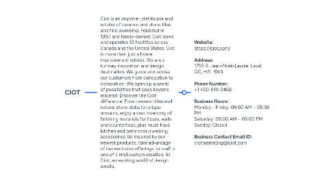 1.1. **Website:** https://ciot.com/ **Address:** 1795 A. Jean-Noël-Lavoie, Laval, QC, H7L 3W3 **Phone Number:** +1 450-910-2468 **Business Hours:** Monday - Friday: 09:00 AM – 05:30 PM Saturday: 09:00 AM – 05:00 PM Sunday: Closed **Business Contact Email ID:** ciotmarketing@ciot.com