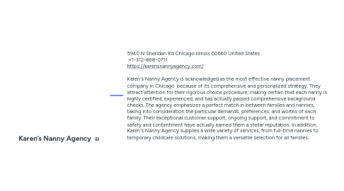 1. 5940 N Sheridan Rd Chicago Illinois 60660 United States +1-312-868-0711 https://karensnannyagency.com/ Karen's Nanny Agency is acknowledged as the most effective nanny placement company in Chicago because of its comprehensive and personalized strategy. They attract attention for their rigorous choice procedure, making certain that each nanny is highly certified, experienced, and has actually passed comprehensive background checks. The agency emphasizes a perfect match in between families and nannies, taking into consideration the particular demands, preferences, and worths of each family. Their exceptional customer support, ongoing support, and commitment to safety and contentment have actually earned them a stellar reputation. In addition, Karen's Nanny Agency supplies a wide variety of services, from full-time nannies to temporary childcare solutions, making them a versatile selection for all families.