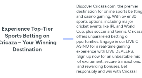 1. Discover Cricaza.com, the premier destination for online sports be tting and casino gaming. With ov er 30 sports options, including ma jor cricket events like IPL and World Cup, plus soccer and tennis, C ricaza offers unparalleled betting o pportunities. Engage in our LIVE C ASINO for a real-time gaming experience with LIVE DEALERS. Sign up now for an unbeatable mix of excitement, secure transactions, and rewarding bonuses. Bet responsibly and win with Cricaza!