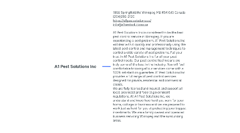 1. 1868 Springfield Rd Winnipeg MB R5R 0J3 Canada (204)292-2120 https://a1pestsolutions.ca/ info@a1pestsolutions.ca A1 Pest Solutions Inc is considered to be the best pest control service in Winnipeg. If you are experiencing a pest problem, A1 Pest Solutions Inc will deal with it quickly and professionally using the latest pest control and management techniques to control a wide variety of pest problems. Put your trust in A1 Pest Solutions Inc for all your pest control needs. Our pest control technicians are truly some of the best in the industry. You will feel comfortable knowing all our services come with a 100% satisfaction guarantee. A1 Pest Solutions Inc provides a full range of pest control services designed for private, residential and commercial clients. We are fully licensed and insured, and support all local, provincial and federal government regulations. At A1 Pest Solutions Inc, we understand and know how hard you work for your home, cottage or business and we are prepared to work just as hard for you at protecting your biggest investments. We are a family owned and operated business servicing Winnipeg and the surrounding areas.