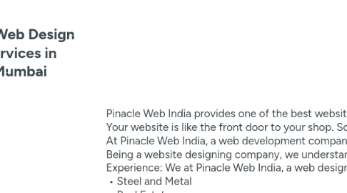 1. Pinacle Web India provides one of the best website designing services in Vashi Mumbai, India. We provide quality websites in a shorter time frame with no bargains for quality. Your website is like the front door to your shop. So making a good first impression on your potential customers is essential. At Pinacle Web India, a web development company, we are a passionate bunch of web designers who love turning ideas into reality. Whether you are starting from scratch, giving your old website a new look, or want something dynamic, we’ve got you covered. Being a website designing company, we understand the value a good website can add to a business. Here are a few reasons you should give us a chance: Experience: We at Pinacle Web India, a web design company, have an experienced team who have plenty of experience to do a first-class job. Some of the projects we have worked on come from the following industries: • Steel and Metal • Real Estate • Immigration • Education • Pharma industry • Interior & Exterior • Computer Accessories • Marine • Automobile • Food & Agro • Electrical • Medical • Beauty & Saloon • Banking & Financial Sector • Insurance • Hospitality Custom Websites: We understand that every business is unique and has its own set of values. Hence, we create websites tailored to meet every business’ individual goals and requirements. Affordability: We offer competitive prices with no compromise for quality. On-time delivery: At Pinacle Web India, we are committed to delivering on time causing no interruptions in your venture. Client First: We believe in clear communication and collaboration. Our designers work based on the client’s vision and turn their ideas into reality. Maintenance and Support: Our team is always there for you to maintain and update your website, address any questions and guide you through the process.