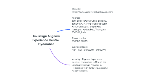1. Website: https://hyderabadinvisalignbraces.com/ Address : Best Smiles Dental Clinic Building, Beside 100 N, Near Manchi Baphe, Hanuman Nagar, Shilpa Hills, Kondapur, Hyderabad, Telangana, 500084, India Phone number: 090300 62849 Business Hours: Mon - Sun : 09:00AM - 09:00PM