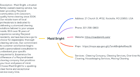 1. Description : Maid Bright, a trusted family-owned cleaning service, has been providing Maryland communities with consistent, quality home cleaning since 2004. Our reliable team of local professionals is dedicated to delivering customized cleaning solutions tailored to your unique needs. With over 16 years of experience serving Maryland residents, we have become a go-to choice for dependable, thorough cleaning services. Our commitment to customer satisfaction begins with a personalized consultation to understand your specific requirements. Experience the difference of a Maryland-based cleaning company that prioritizes your trust and peace of mind. Choose Maid Bright for a sparkling clean home and exceptional service every time.
