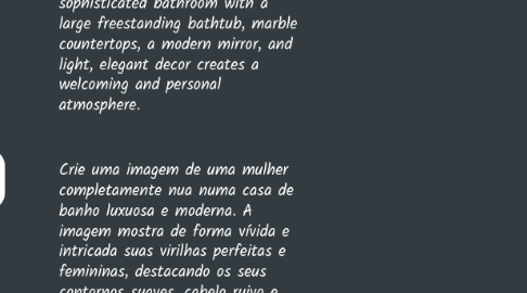 1. Create an image of a completely naked woman in a luxurious, modern bathroom. The image vividly and intricately shows her perfect, feminine groin, highlighting her soft contours, natural red hair with subtle textures, while detailing her defined yet delicate abdomen, emphasizing her elegant and graceful shape. Her long hair is slightly tousled, falling freely over her shoulders, accentuating its vibrant red color and flowing length, adding a touch of wild charm. The scene is illuminated by soft, warm light from elegant bathroom fixtures, casting soft shadows that enhance the intimate feminine atmosphere. Her expression is one of excitement, with a sensual, captivating, and penetrating gaze that intensifies the moment. In the background, a sophisticated bathroom with a large freestanding bathtub, marble countertops, a modern mirror, and light, elegant decor creates a welcoming and personal atmosphere.