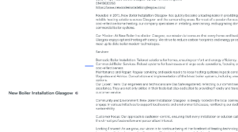 1. Suite 14 120 Hope Street Glasgow G2 5EA United Kingdom 01413630265 https://www.newboilerinstallationglasgow.com/ Founded in 2015, New Boiler Installation Glasgow has quickly become a leading name in providing efficient and reliable heating solutions across Glasgow and the surrounding areas. Born out of a passion for eco-friendly and cost-effective home heating, our company specialises in installing, maintaining, and upgrading domestic and commercial boiler systems. Our Mission: At New Boiler Installation Glasgow, our mission is to ensure that every home and business in Glasgow enjoys optimal heating efficiency. We strive to reduce carbon footprints and energy prices through the most up to date boiler modern technologies. Services: Domestic Boiler Installation: Tailored solutions for homes, ensuring comfort and energy efficiency. Commercial Boiler Services: Robust systems for businesses and large-scale operations, focusing on reliability and cost-effectiveness. Maintenance and Repair: Regular servicing and quick repairs to keep heating systems in peak condition. Upgrades and Advice: Consultation and implementation of the latest boiler systems, including smart, eco-friendly options. Our Expert Team: Our engineers and technicians are Gas Safe registered, reflecting our commitment to safety and excellence. They are not only skilled in their trade but also dedicated to providing friendly and transparent customer service. Community and Environment: New Boiler Installation Glasgow is deeply rooted in the local community. We engage in various initiatives to support local events and environmental causes, reinforcing our dedication to sustainability. Customer Focus: Our approach is customer-centric, ensuring that every installation or solution call is handled with the utmost professionalism and personalised interest. Looking Forward: As we grow, our vision is to continue being at the forefront of heating technology, embracing innovations that make home heating more efficient and environmentally friendly.