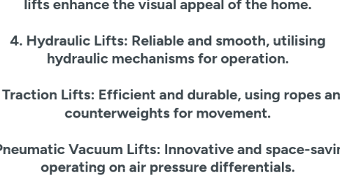 Types of Home Elevator Lift in India Home elevator lifts in India are becoming increasingly popular, offering convenience, accessibility, and a touch of luxury to residential spaces. These lifts come in various types, catering to different needs and preferences. 1. Small Lift for Home: Ideal for limited space, these compact lifts offer seamless vertical movement. 2. Large Home Lifts: Designed for spacious homes, providing ample room for multiple passengers. 3. Glass Lift for Home: Aesthetic and modern, these lifts enhance the visual appeal of the home. 4. Hydraulic Lifts: Reliable and smooth, utilising hydraulic mechanisms for operation. 5. Traction Lifts: Efficient and durable, using ropes and counterweights for movement. 6. Pneumatic Vacuum Lifts: Innovative and space-saving, operating on air pressure differentials. 7. Wheelchair Lifts: Ensuring accessibility, designed specifically for wheelchair users. 8. Home Stair Lift: Perfect for staircases, offering a safe ride up and down stairs. 9. Platform Lifts: Versatile and practical, ideal for short distances and various applications. Do you live or work anywhere in India? You can call us. We'll listen to what you want. If you need a Home elevator in your home, we can help. We have all types of home elevators. https://www.atticoelevators.com/types-of-lift-for-home/