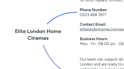 1. **Website:** https://www.elitelondonhomecinemas.co.uk **Address:** 18 Soho Square, London, W1D 3QH **Phone Number:** 0203 488 3971 **Contact Email:** elitelondonhomecinemas@gmail.com **Business Hours:** Mon - Fri : 08:00 am - 06:00 pm